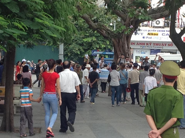 Ở trong Sài Gòn thì họ làm gắt lắm, họ theo dõi từ mấy bữa trước, họ canh mình ở nhà tới cả chục người. Tụi em biết là ra khỏi nhà sẽ bị bắt và làm phiền ngay, nên tụi em cũng không ra khỏi nhà luôn. Có vài người ra được công viên uống cà phê nhưng thấy bên mình ít quá, bên họ thì đông nên cũng không nhen nhúm lên được. Anh Hòang Dũng của Con đường Việt Nam cũng bị họ vây bắt nhưng anh ấy trốn được. Nói chung là ở Sài Gòn không xảy ra biểu tình được. Chiều này ra khỏi nhà để đi lễ với bạn, họ thấy mình ra thì họ giải tán.