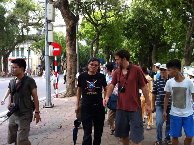 Nguyễn Hữu Vinh: “Cuộc biểu tình hôm nay diễn ra như thế này. Khi nhóm đầu tiên bắt đầu thì lực lượng côn đồ, công an bắt người ta lên xe búyt. Rồi sau đó đến nhóm thứ hai, rồi nhóm thứ ba, cuộc biểu tình kéo quanh bờ Hồ và cuối cùng thì có nhiều người bị bắt lên trại phục hồi nhân phẩm.”
