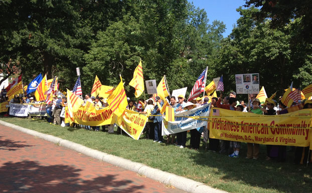 Sáng hôm nay 25 tháng 7 vào lúc 8 giờ, giờ Washington DC đồng bảo Việt kiều của nhiều tiểu bang đã tập trung tại trung tâm thuơng mại Eden thuộc tiểu bang Virginia để được xe buýt chở vào thủ đô đến công viên La Fayette đối diện với Nhà Trắng biểu tình chống Chủ tịch nước Trương Tấn Sang dự kiến sẽ gặp gỡ với Tổng thống Barak Obama vào sáng hôm nay tại White House.