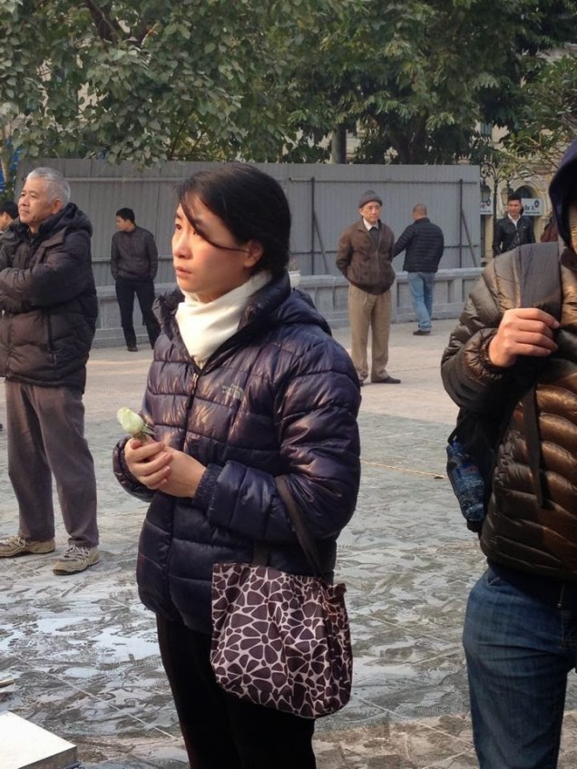 Trên tay mỗi người là một cành hoa tưởng niệm