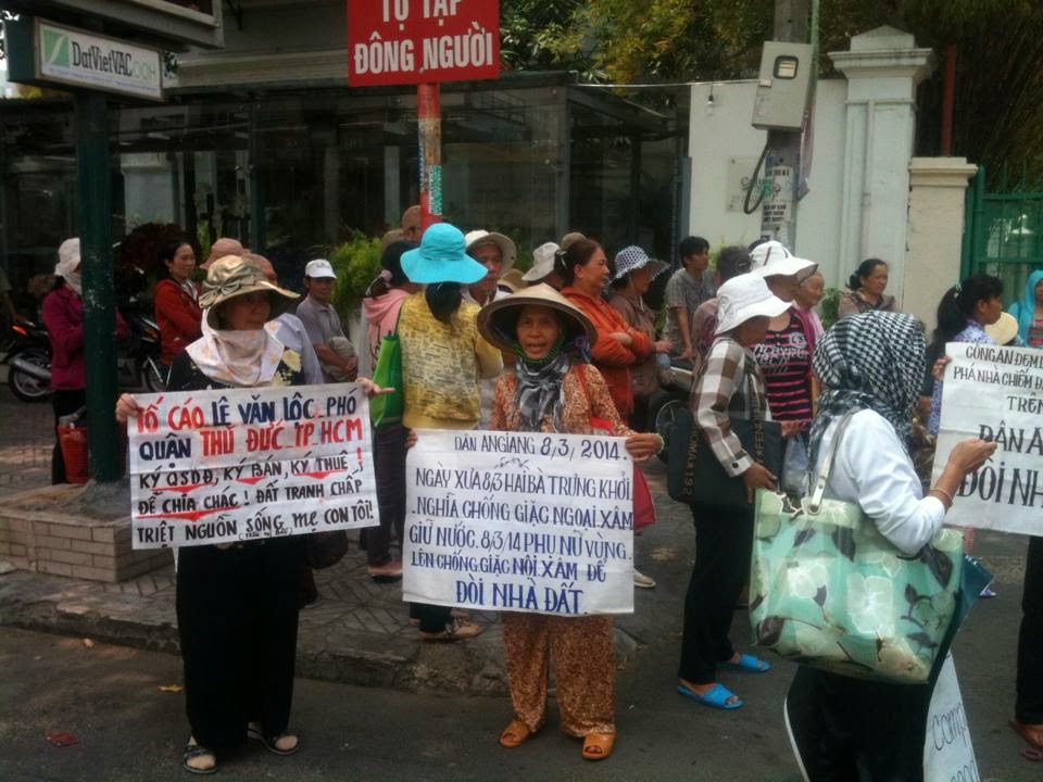 Mặc Lâm, biên tập viên RFA, Bangkok. 2014-03-26 http://www.rfa.org/vietnamese/in_depth/doze-gath-for-an-suppr-03262014052858.html Nhiều phụ nữ dân oan tập trung biểu tình ở TP.HCM hôm 26/03/2014, đòi nhân quyền, nữ quyền và chống cưỡng chế đất đai. Citizen photo Sáng 26/03/2014, hàng chục dân oan kéo tới hai địa điểm là Dinh Thống Nhất và Nhà thờ Đức BàĐọc tiếp “Dân oan khiếu kiện đất đai biểu tình ở Sài Gòn”