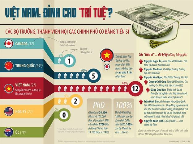 Nguyen Van Tuan – 19/03/2014 http://nguyenvantuan.org/tin-tuc/bang-cap-cua-cac-bo-truong-viet-nam-china-mi-va-uc.aspx#.Uy5OB1c_r5N Khoảng 2 năm trước, do tính tò mò, tôi đếm số thành viên nội các VN, Mĩ và Úc, và so sánh trình độ học vấn qua bằng cấp của họ. Kết quả cho thấy 13/26 người có bằng tiến sĩ (www.tuanvietnam.net/2010-08-08-trinh-do-hoc-van-bo-truong). Nhân dịp thấy một danh sách thànhĐọc tiếp “Bằng cấp của các bộ trưởng Việt Nam, China, Mĩ, và Úc”