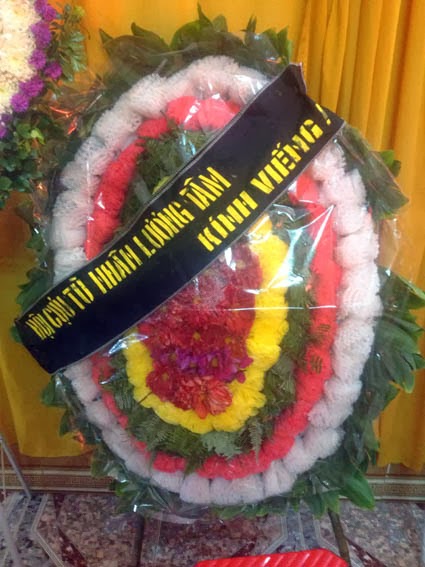 Và một vòng hoa được trả lại sau khi xé bỏ tên nhóm người kính viếng và thay thế bằng tấm vải đen với vỏn vẹn 2 chữ “kính viếng”:
