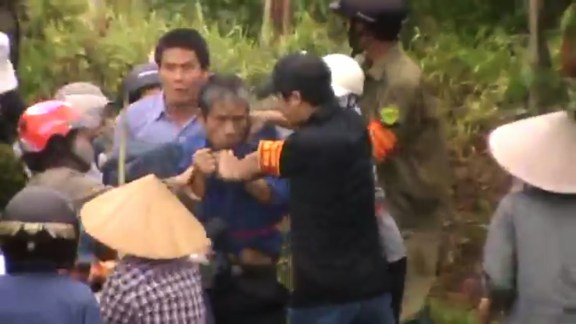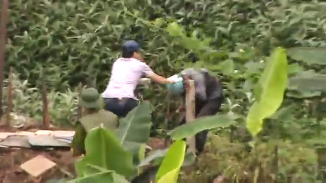 Trong video, có thể nghe thấy tiếng than khóc của chị Cấn Thị Thêu khi thấy chồng bị CA đánh đập. Chị Thêu khi ấy đang đứng trên chòi để ghi lại hình ảnh cưỡng chế. Sau đó, CA phát hiện chị đang quay phim liền trèo lên dùng thuốc mê tấn công, rồi dùng xe xúc đất cẩu chị xuống đất.