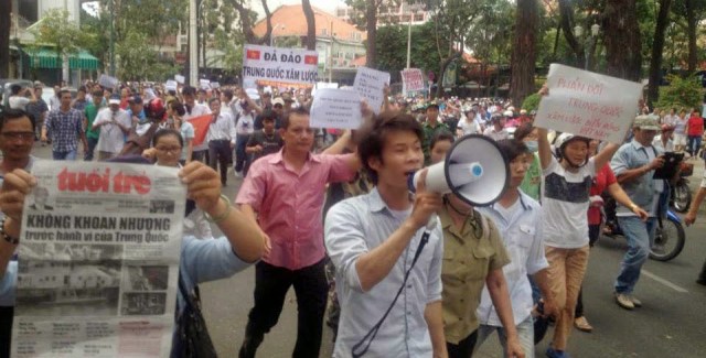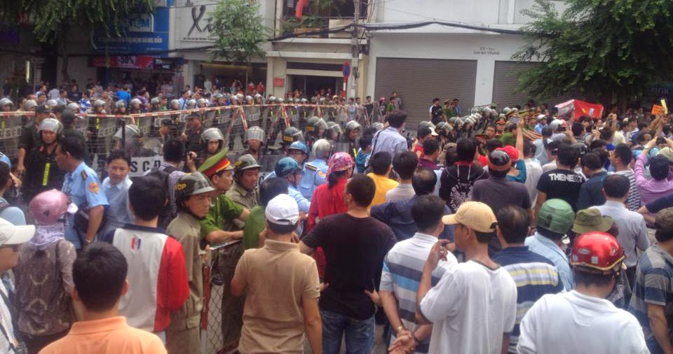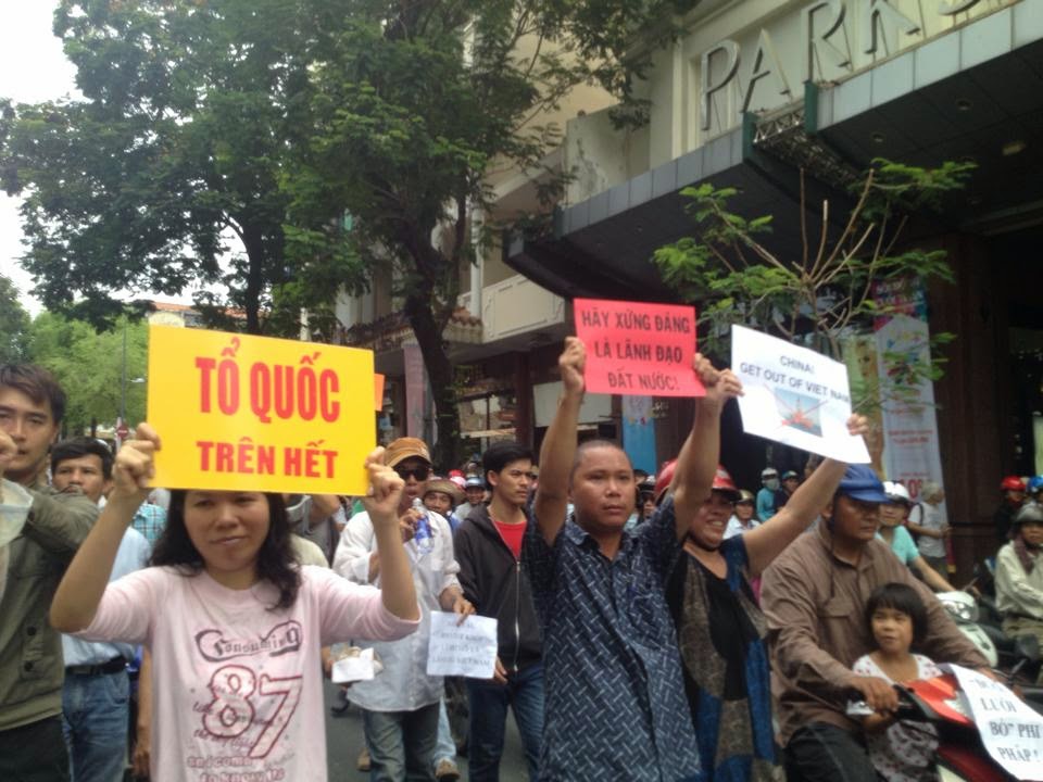 Lúc 09:30 phút sáng: Tại Sài Gòn, sau khi bị hàng rào an ninh dày đặc ngăn chặn tiếp cận tòa Tổng lãnh sự quán Trung Quốc, đoàn biểu tình đã quay ngược lại tuần hành hướng về khu vực nhà văn hóa Thanh Niên. Nhiều khẩu hiệu và tiếng hô ‘Tự do cho người yêu nước’ vang lên trong cuộc biểu tình. (Ảnh CTV Danlambao)