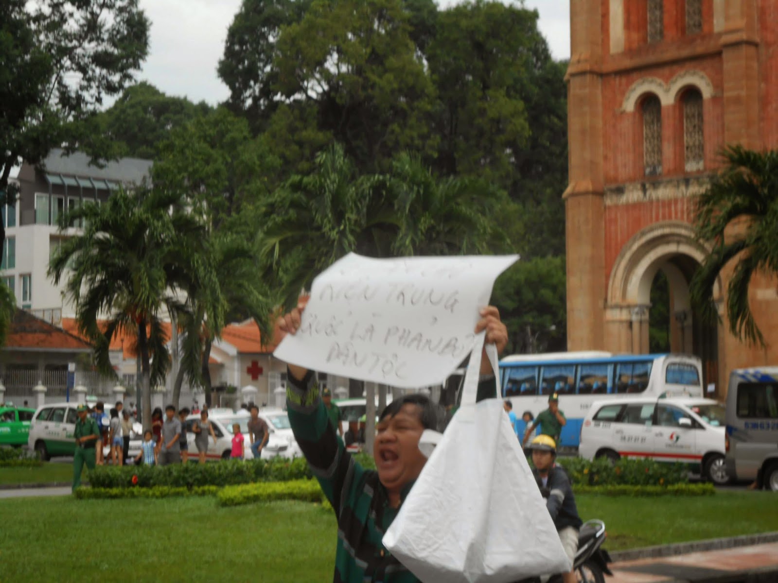 “Mấy ngày nay tôi phẫn nộ khi thấy vùng biển của mình bị Trung Quốc nó mang giàn khoan vào nhiều quá. Trong khi nhà nước vẫn chưa dám kiện Trung Quốc, thế nên tui mang biểu ngữ “Chần chừ kiện Trung Quốc là phản bội Dân Tộc” cho tất cả mọi người cùng thấy.”