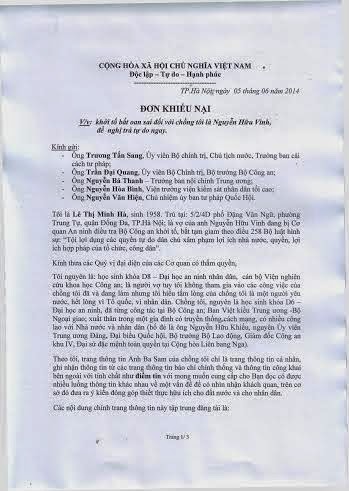 Tôi là Lê Thị Minh Hà, sinh 1958. Trú tại: 5/2/4D phố Đặng Văn Ngữ, phường Trung Tự, quận Đống Đa, TP.Hà Nội; là vợ của anh Nguyễn Hữu Vinh đang bị Cơ quan An ninh điều tra Bộ Công an khởi tố, bắt tạm giam theo điều 258 Bộ luật hình sự: “Tội lợi dụng các quyền tự do dân chủ xâm phạm lợi ích nhà nước, quyền, lợi ích hợp pháp của tổ chức, công dân”.