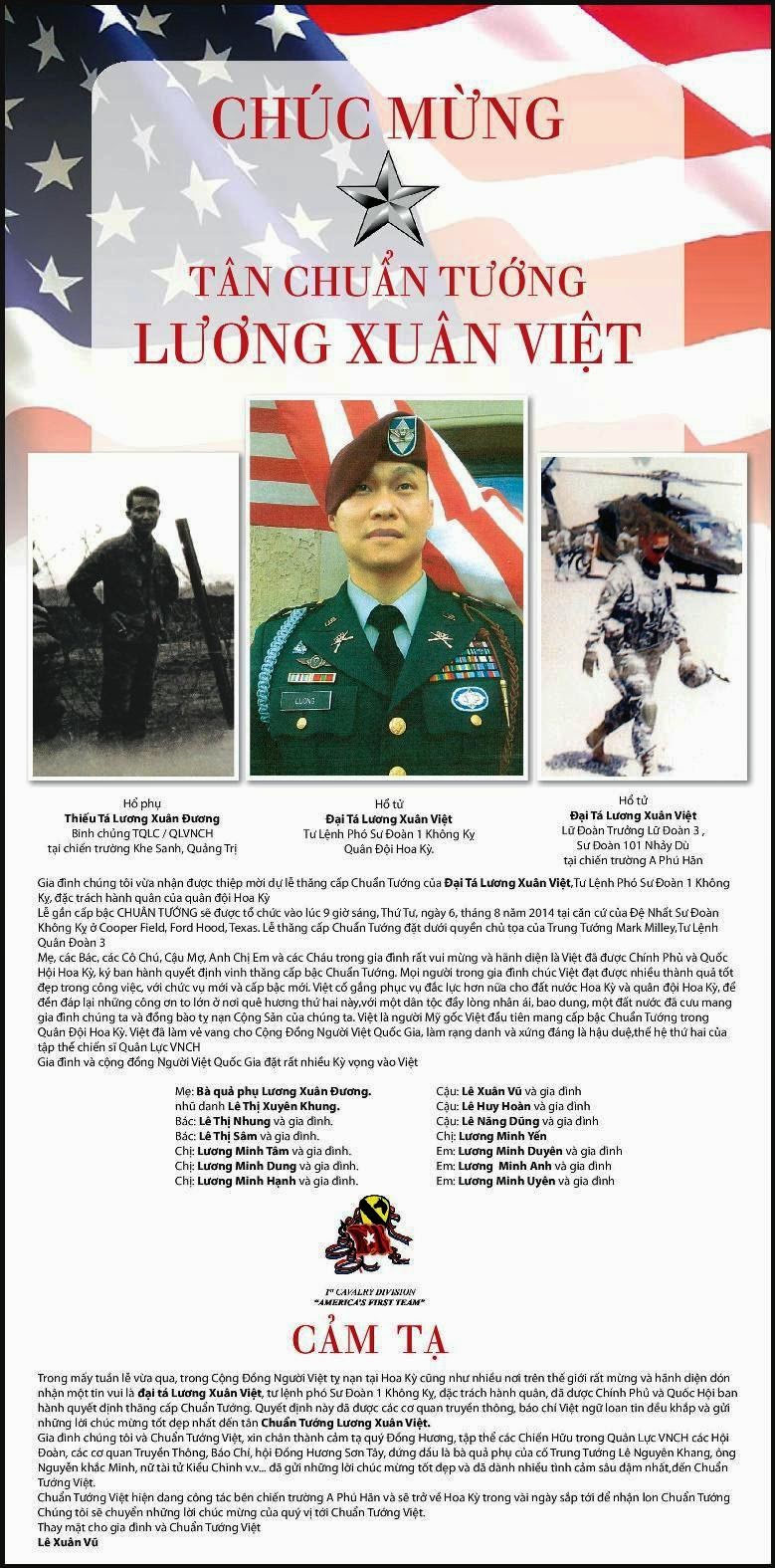 FORT HOOD, Texas (NV) – Ðại Tá Lương Xuân Việt, phó tư lệnh đặc trách hành quân Sư Ðoàn 1 Thiết Kỵ được vinh thăng Chuẩn Tướng sáng 6 Tháng Tám, 2014, trở thành người gốc Việt đầu tiên được thăng cấp tướng trong lịch sử quân đội Hoa Kỳ.