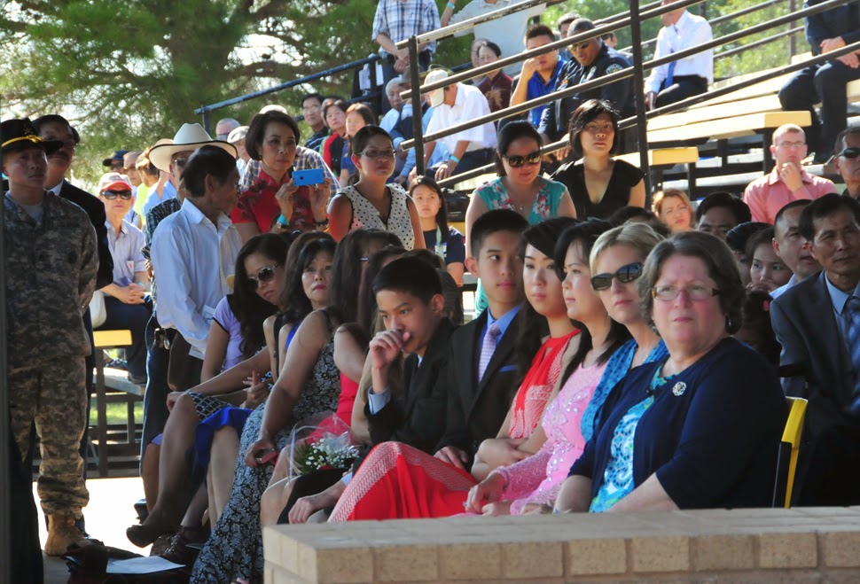 Bên trái khán đài, ở ghế hàng đầu là gia đình vị tân chuẩn tướng, gồm mẹ, vợ, ba người con của ông, cùng bảy chị em gái. Phía sau là rất nhiều cựu quân nhân, sĩ quan của đủ mọi binh chủng trong quân lực Việt Nam Cộng Hòa, trong đó có cậu, có bác của ông, cũng như một số đồng đội của thân phụ Chuẩn Tướng Lương Xuân Việt trước đây.