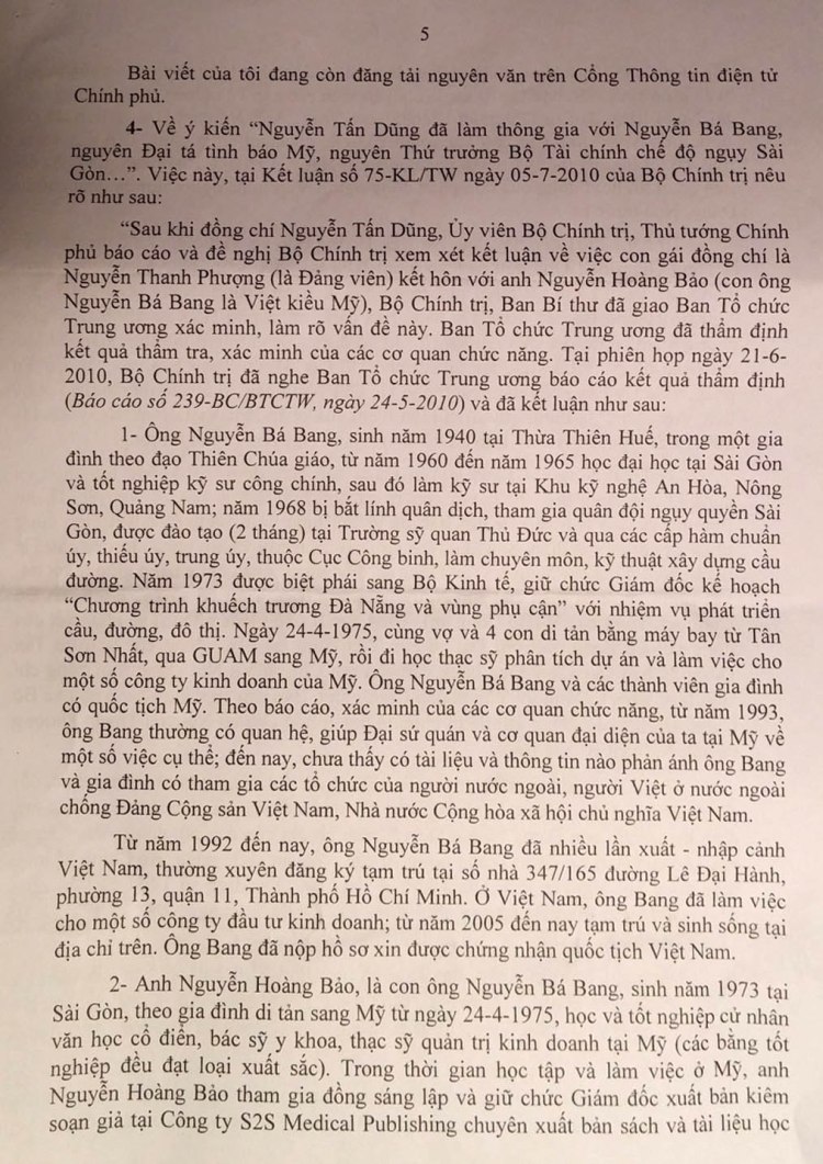 Về ý kiến “Con gái tôi Nguyễn Thanh Phượng, Ủy viên HĐQT, Bí thư đảng bộ Ngân hàng Thương mại cổ phần Bản Việt đã nhập quốc tịch Mỹ… con gái tôi giàu có nhanh, làm chủ một khối tài sản lớn…”, “…con trai tôi, cháu Nguyễn Thanh Nghị được bầu làm Ủy viên Dự khuyết TƯ và Bí thư Tỉnh ủy Kiên Giang… cháu Nguyễn Minh Triết được bầu làm Tỉnh ủy viên Bí thư Tỉnh đoàn Bình Định…” tôi xin báo cáo…