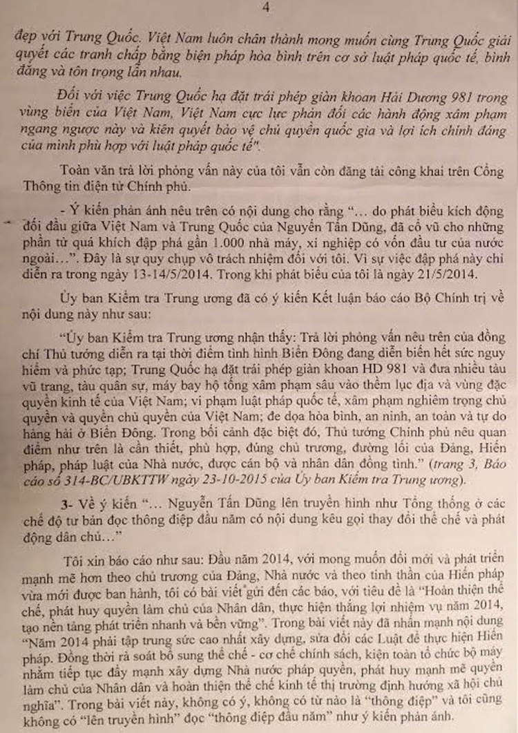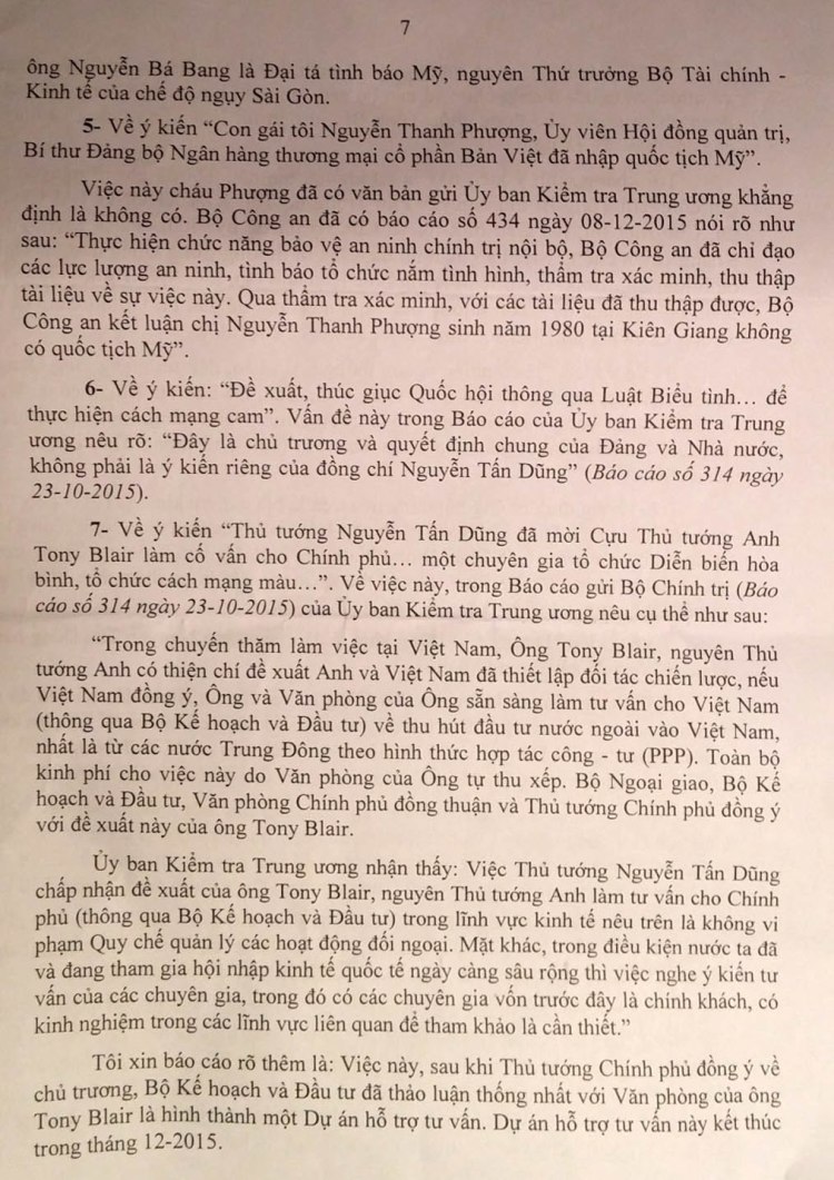 Về ý kiến “…Thủ tướng nay đã hình thành “nhóm lợi ích” trên phạm vi cả nước, cả người đương chức và cán bộ cao cấp nghỉ hưu… vận động với các thủ đoạn nhằm giành cho được chức Tổng bí thư tiến tới làm Tổng thống và thay đổi chế độ, thay đổi Đảng”… Tôi khẳng định ý kiến này là vu khống, bịa đặt…