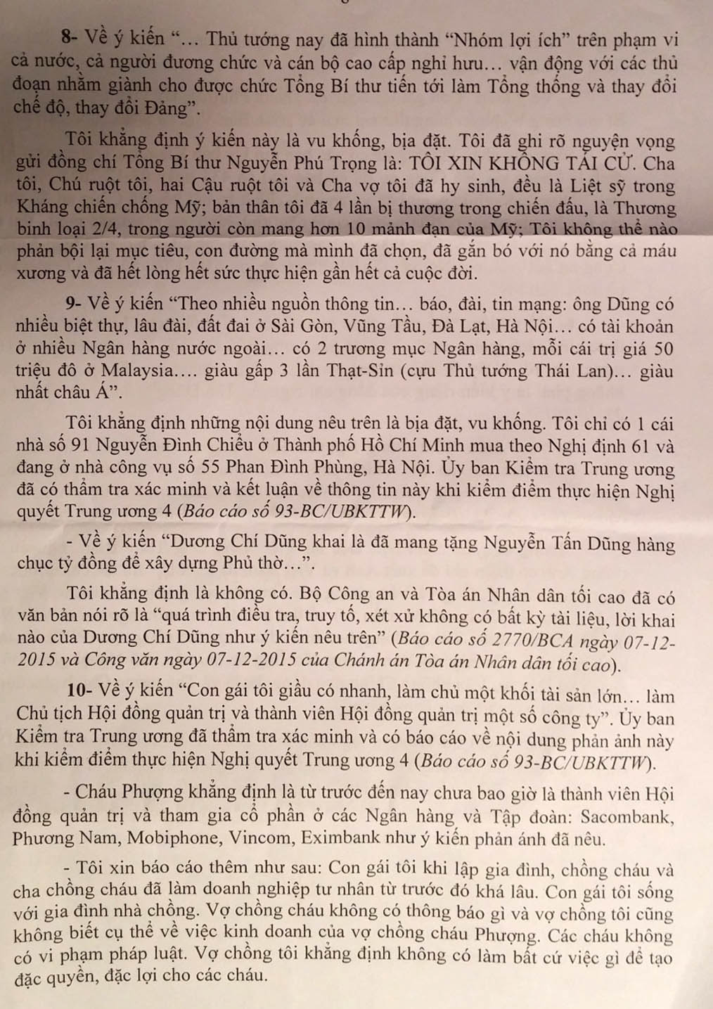 Về ý kiến “…Thủ tướng nay đã hình thành “nhóm lợi ích” trên phạm vi cả nước, cả người đương chức và cán bộ cao cấp nghỉ hưu… vận động với các thủ đoạn nhằm giành cho được chức Tổng bí thư tiến tới làm Tổng thống và thay đổi chế độ, thay đổi Đảng”… Tôi khẳng định ý kiến này là vu khống, bịa đặt…
