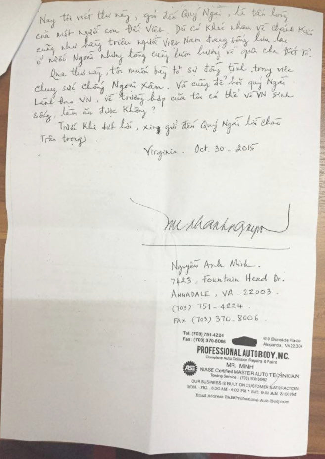 | Thư gửi Lãnh đạo Việt Nam của ông Nguyễn Anh Minh (trang 1) |
