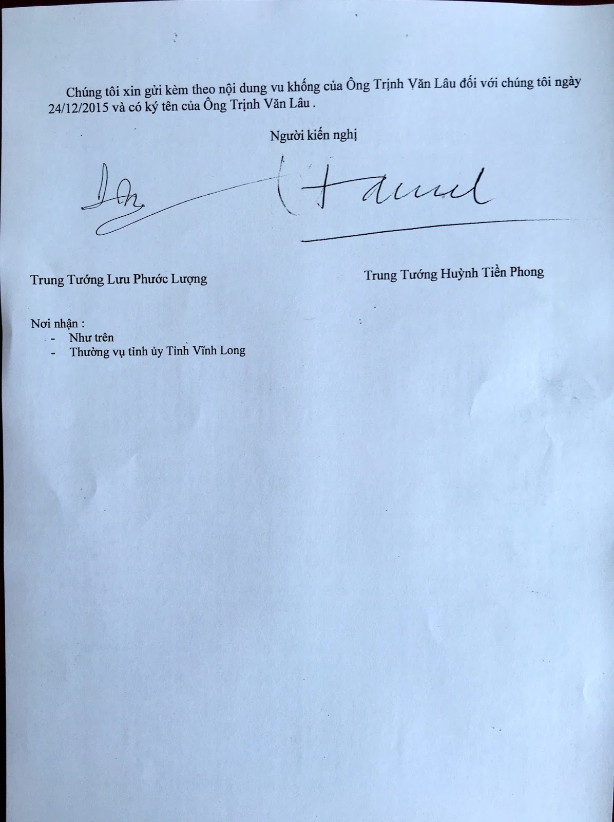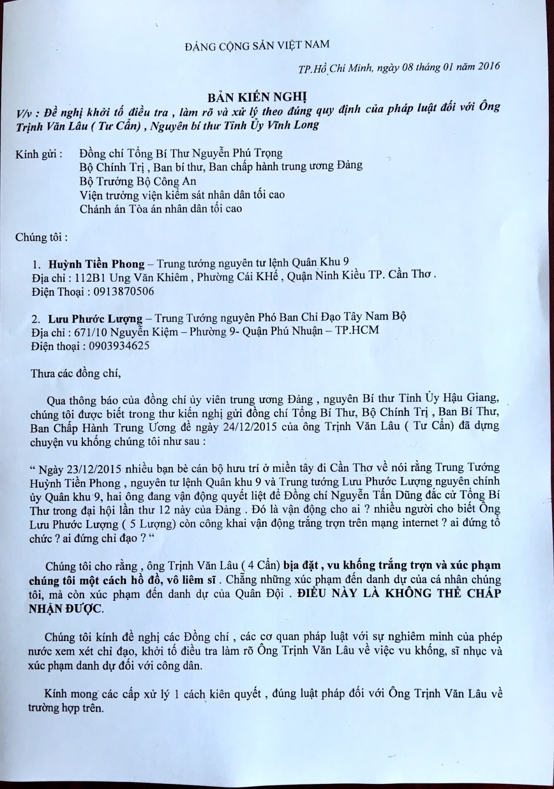 Ban biên tập tiếp tục nhận được đơn kiến nghị của Trung tướng Huỳnh Tiền Phong – Nguyên Tư lệnh Quân khu 9 và Trung tướng Lưu Phước Lượng – Nguyên Phó ban chỉ đạo Tây Nam Bộ gửi Tổng Bí thư Nguyễn Phú Trọng, Bộ Chính trị, Ban Chấp hành Trung ương và các cơ quan chức năng về hành vi bịa đặt, vu khống trắng trợn và xúc phạm danh dự của 02 vị tướng và danh dự của Quân đội Nhân dân Việt Nam của ông Trịnh Văn Lâu (Tư Cẩn, sinh năm 1929, nguyên Bí thư Tỉnh ủy Vĩnh Long).