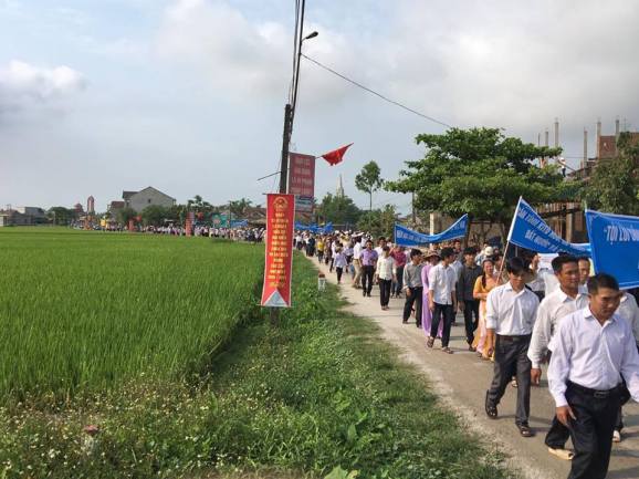 Dưới sự dẫn dắt của các linh mục Nguyễn Đình Thục và Trần Đình Tề, bà con mang theo nhiều biểu ngữ kéo đến tập trung trước trụ sở cơ quan công quyền nhằm yêu cầu minh bạch vụ cá chết.