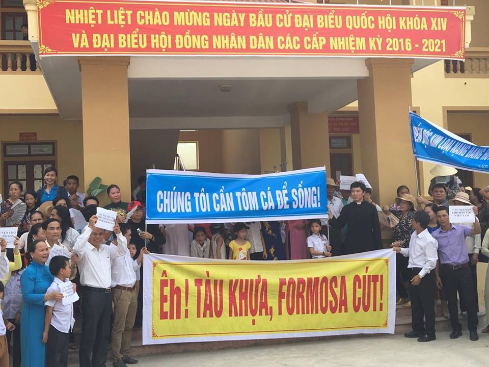 Dưới sự dẫn dắt của các linh mục Nguyễn Đình Thục và Trần Đình Tề, bà con mang theo nhiều biểu ngữ kéo đến tập trung trước trụ sở cơ quan công quyền nhằm yêu cầu minh bạch vụ cá chết.