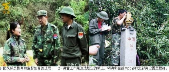 1- Nhóm chuyên viên đàm phán và giám sát tiến trình phân định biên giới. 2 – Nhóm công tác đo đạt phân định lãnh thổ, lãnh hải và thiết lập cột mốc tại miền Bắc Việt Nam và vùng Vịnh Bắc Bộ. Tài liệu ảnh lưu: Huỳnh Tâm.