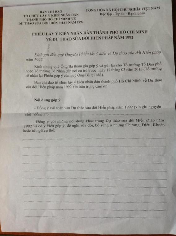 Sau đó, mỗi hộ dân tại TP.HCM bắt đầu được phát một tập tài liệu 79 trang so sánh Hiến pháp 1992 với dự thảo Hiến pháp do Uỷ ban dự thảo sửa đổi Hiến pháp 1992 đưa ra. Kèm theo đó là một bản “Phiếu lấy ý kiến nhân dân Thành phố Hồ Chí Minh về dự thảo sửa đổi hiến pháp 1992”.